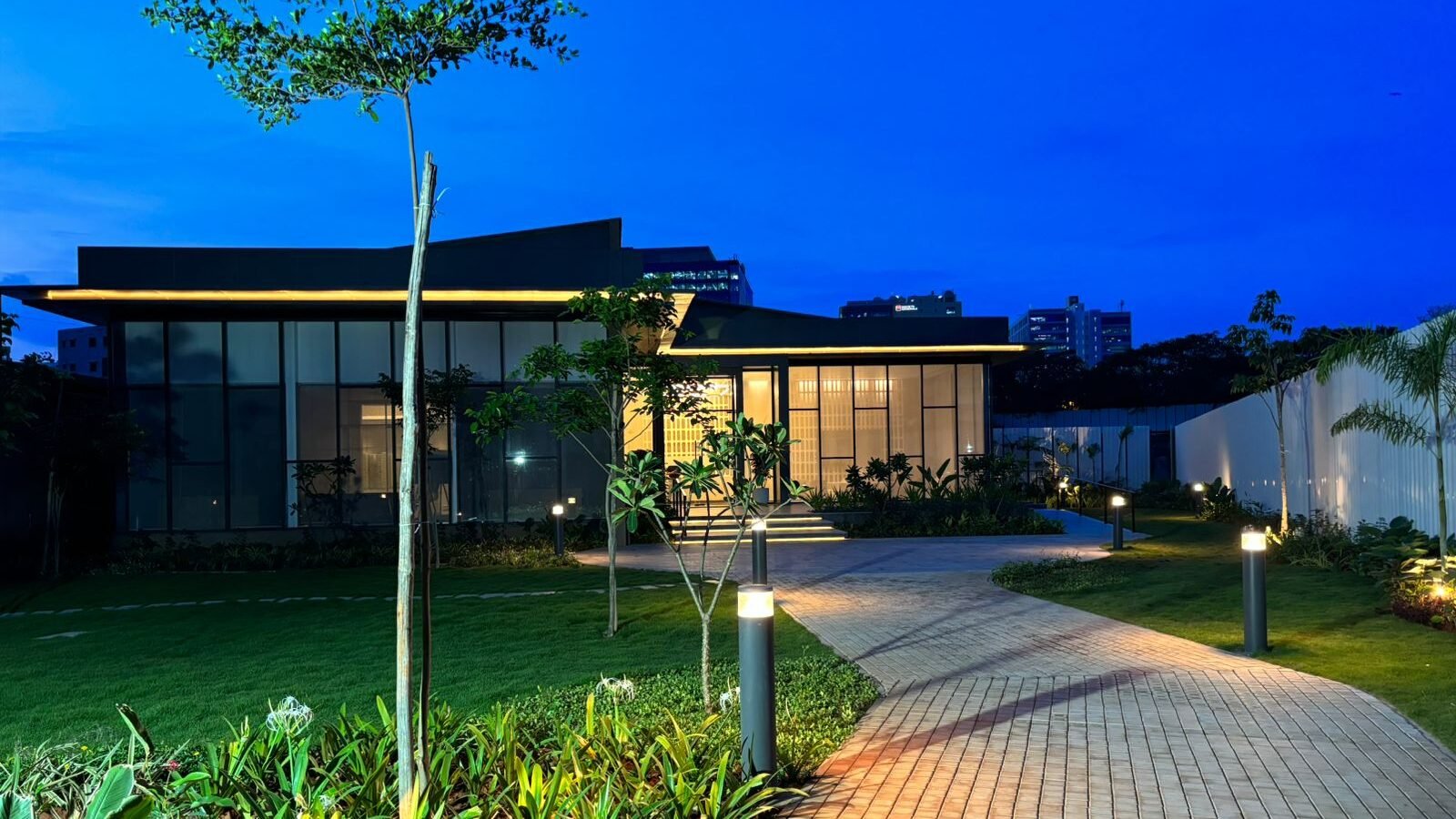 A meandering walkway bordered by a lush, uninterrupted carpet of greenery, invites visitors to pause and appreciate the diverse array of tropical plants ahead. At the heart of this rich design lies a tree court — a central feature composed of carefully selected shade-giving trees that form a natural canopy, ensuring a cohesive blend of architectural elements, green cover and materials; thereby fostering social interaction and creating a serene gathering space.